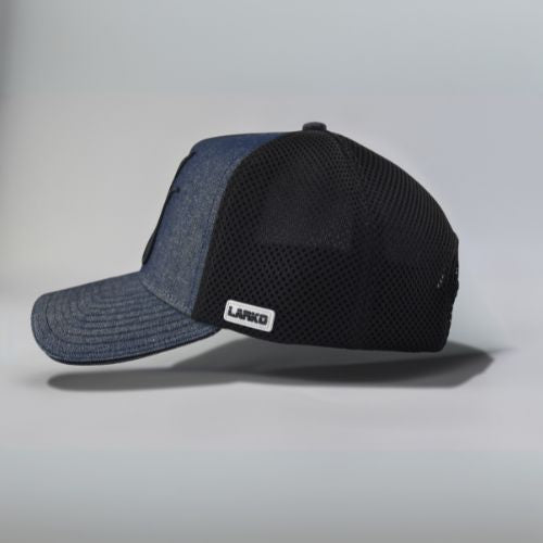 Introducing our Dark Denim Core Line Premium Trucker Cap – a fresh twist on the classic trucker that's sure to turn heads. Crafted from dark denim and premium black mesh with blue stitching, this cap is built for lasting style.